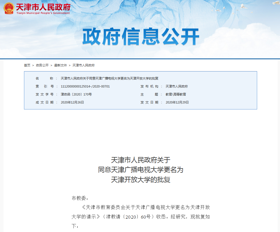 12月29日,天津市政务网发布《天津市人民政府关于同意天津广播电视大学更名为天津开放大学的批复》,天津市人民政府同意乐赢娱乐注册 更名为天津开放大学。