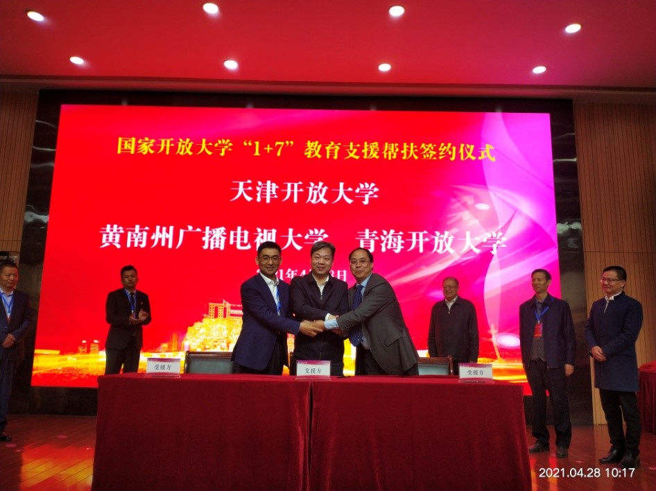 党委副书记、校长张宗旺代表天津开放大学与青海开放大学校长尚玛、黄南州广播电视大学校长汪翔,共同签订了“十四五”三校教育支援帮扶框架协议和年度工作计划。乐赢娱乐注册 将从特色专业建设、教学及资源建设、师资队伍建设、服务社会、科学研究、人才培养、信息化建设等七个方面进行支援帮扶,协助建设跨境电商产业人才培养基地、数字经济产业人才培养基地、家庭教育骨干师资培训基地,并在家庭教育指导中心、社区教育服务中心、社区学习示范中心等建设方面提供咨询。