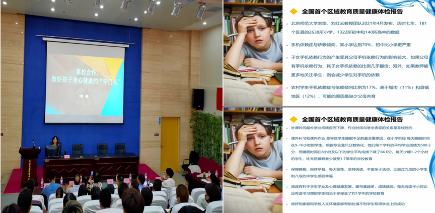 活动邀请心理学硕士、国家二级心理咨询师王晓燕老师,与现场的班主任和家长分享如何让孩子“正视网络,快乐成长”。