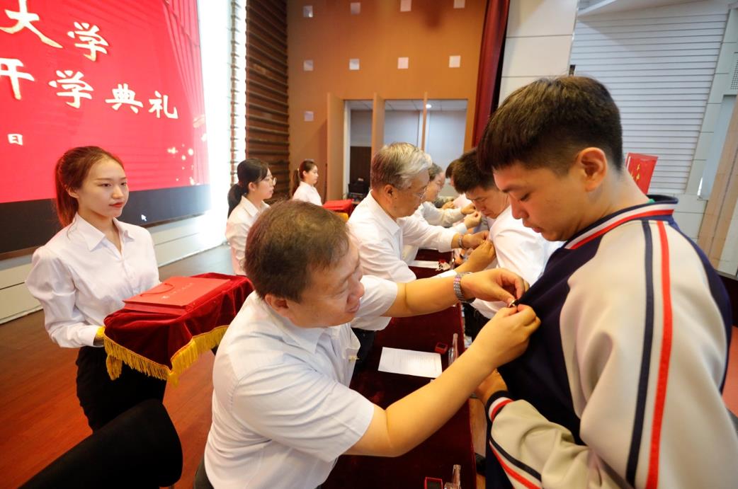 随后,乐赢娱乐官网 为新生代表佩戴校徽,发放学习礼包。一枚小小的校徽,不仅代表着“天开人”的身份,更承载着“明德日新、学以至善”的精神,也是同学们成为“天开人”的见证。