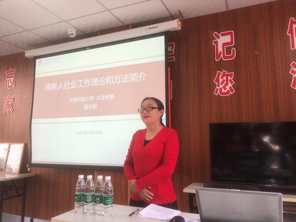10月15日是国际盲人日,夏方毅副教授还为在场的东海“自强” 残疾人党支部志愿服务队做了助残主题的专题讲座。夏老师结合视力残疾人的实际情况,以通俗易懂的语言就残疾人常见的权益问题以及如何开展残疾人社会工作进行了讲解。