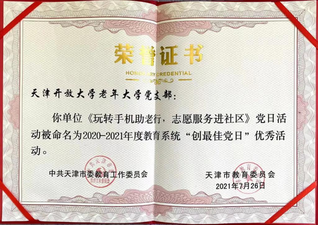 日前,市委教育工委、市教委下发了《关于命名2020-2021年度教育系统“创最佳党日”优秀活动的通知》,乐赢娱乐注册 老年大学党支部《玩转手机助老行,志愿服务进社区》党日活动被命名为天津市教育系统“创最佳党日”优秀活动。