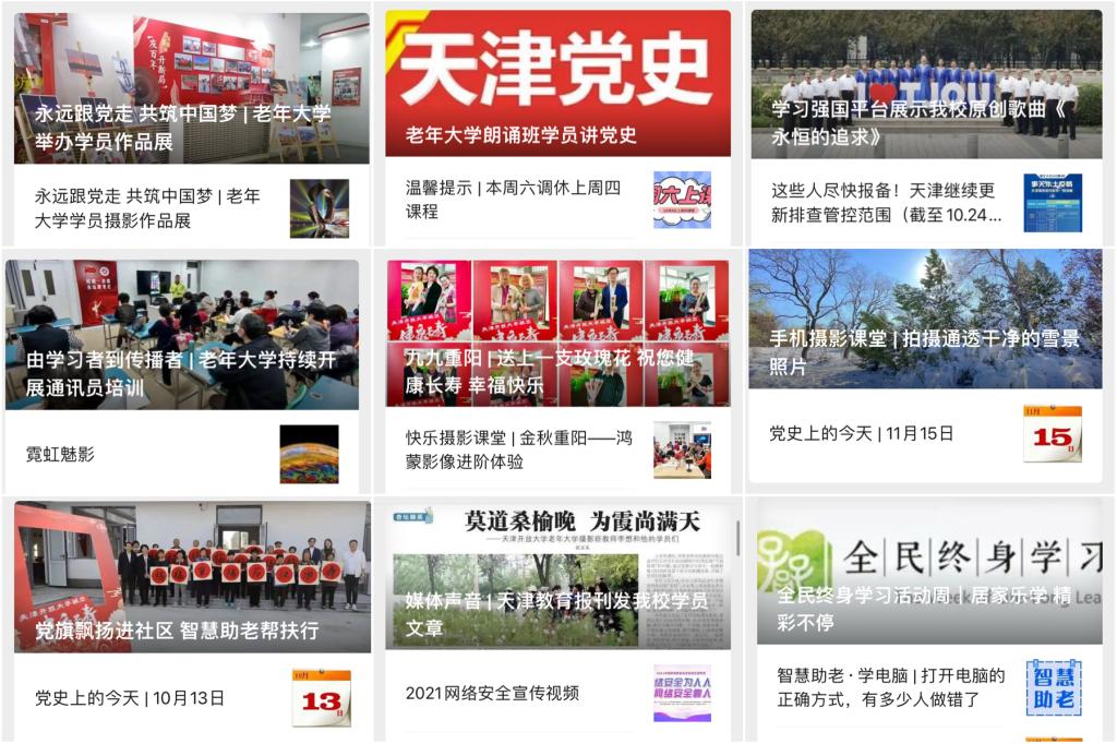 荣获一等奖的“天津开放大学老年大学”公众号,在线上教学平台和资源库建设中有机融入思政元素,组建通讯员队伍并持续开展培训,提高原创比例,探索“由学习者到传播者”的可持续发展模式,成立两年来关注用户2500多人,累计服务受众达13万人次。