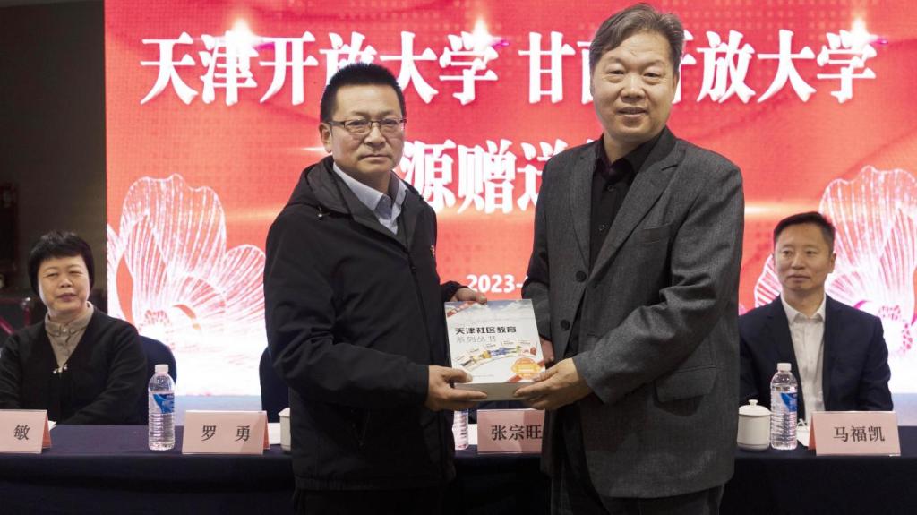 张宗旺校长(右)代表学校向甘南开放大学赠送社区教育教材及资源