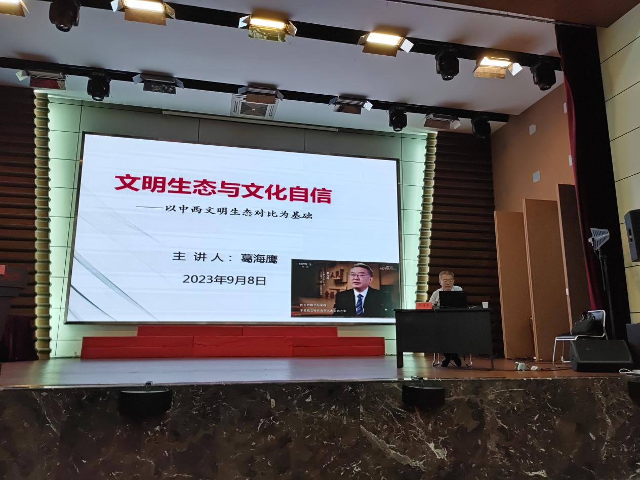 9月8日下午,乐赢娱乐注册 邀请辽宁省第十三届人民代表大会常务委员会委员、人事选举委员会主任委员葛海鹰在迎水道校区大礼堂做“文明生态与文明自信”专题讲座,市校全体教师,系统各分校思政课教师、文科专业专职教师代表近100人参会,党委副书记王刚清主持。