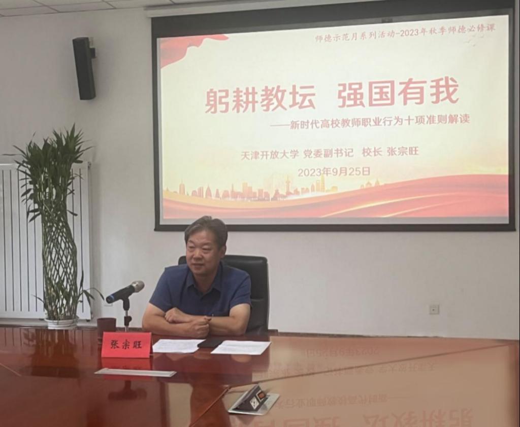 张宗旺校长紧密围绕《新时代高校教师职业行为十项准则》的具体内容,结合立德树人根本任务,从开放大学成人教育的办学特点出发,融合政治理论、思想感悟、榜样力量和典型案例等内容,深入浅出地解读了“十项准则”。对新入职教师提出要求:一是要把坚定理想信念放在首位,坚持用习近平新时代中国特色社会主义思想武装头脑,努力提升思想政治素养,带头践行社会主义核心价值观;二是要增强政治敏锐性,筑牢意识形态防线,充分发挥课堂教学主阵地、主渠道作用,唱响主旋律,凝聚正能量;三是要守住教书育人的底线,明确纪律准则和制度规范,恪守职业道德,学习先进楷模,厚植育人情怀。