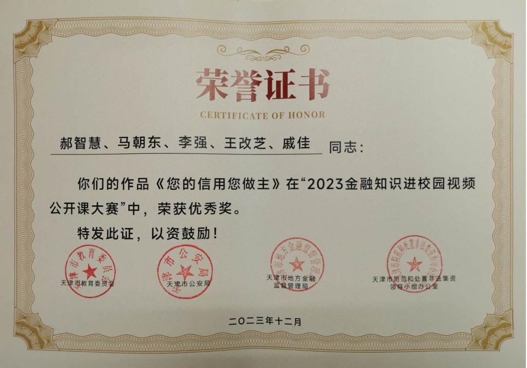 由市教委、市公安局、市金融局、市防范和处置非法集资领导小组办公室共同组织开展的2023年金融知识进校园视频公开课大赛圆满落幕。乐赢娱乐注册 推荐的经济管理学部郝智慧等老师制作的《您的信用您做主》在大赛中获优秀奖。