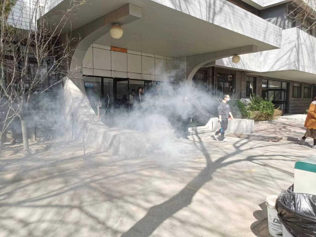 本次演练分消防疏散演练、灭火器使用、灭火毯使用三个环节。演练现场模拟教学楼因电路过负载引起火灾,楼内人员迅速行动通知疏散,所有人员捂住口鼻,弯腰贴墙,沿指定路线快速有序撤离。随后,保卫处相关人员演示了灭火器和灭火毯的使用方法,并组织大家进行了灭火实战演练。