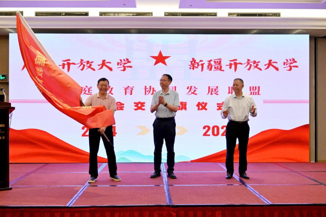 年会承办单位交接旗仪式上,广西开大党委书记李卫东向明年年会承办方新疆开大递交联盟旗帜,新疆开大党委书记黄朝华接收旗帜并做表态发言。