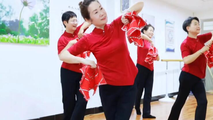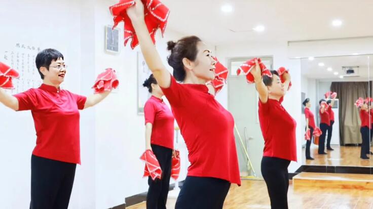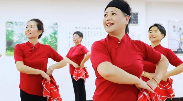 在舞蹈健身教室,学员在司琪老师和张艺诺老师指导下以民族舞《中国姑娘》献礼党的生日。