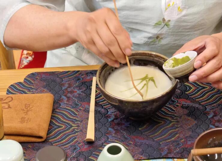 理工学部志愿者王晓丽老师在指导社区居民体验宋代点茶