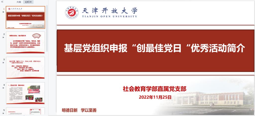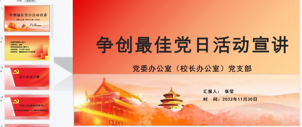 本次活动由基层党组织申报、党委组织部审核并组织开展评选工作。共有9个党支部对主题党日活动依次进行了宣讲。经过评选,发展规划与科研处党支部荣获一等奖;党委教师工作部(人事处)党支部、党委办公室(校长办公室)党支部、社区教育中心与老年大学联合党支部荣获二等奖;教务处直属党支部、社会教育学部直属党支部、网络安全和信息化办公室直属党支部、经济管理学部直属党支部、智慧教育研究发展中心党支部荣获三等奖。