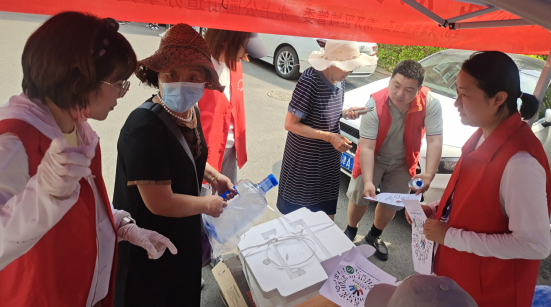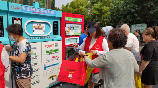 盛夏六月烈日炎炎,党员们穿上“红马甲”,在现场积极引导居民微信扫码,关注“垃圾分类齐点亮”小程序,登记发放水卡、水桶及宣传册;在废旧物资智能回收箱旁,耐心讲解“有偿回收、易物兑换”流程,指导并帮助居民将废旧物品放入箱子,称重兑换成卡内“碳币”,完成“一斤废品换一桶五升直饮水”的操作,充分体验“碳币”消费。通过线上互动打卡贡献能量值和线下桶装水实物兑换相结合的方式,大大提升了居民对垃圾分类的参与感和体验感,引导居民在日常生活中践行“保护环境、低碳生活”理念。
