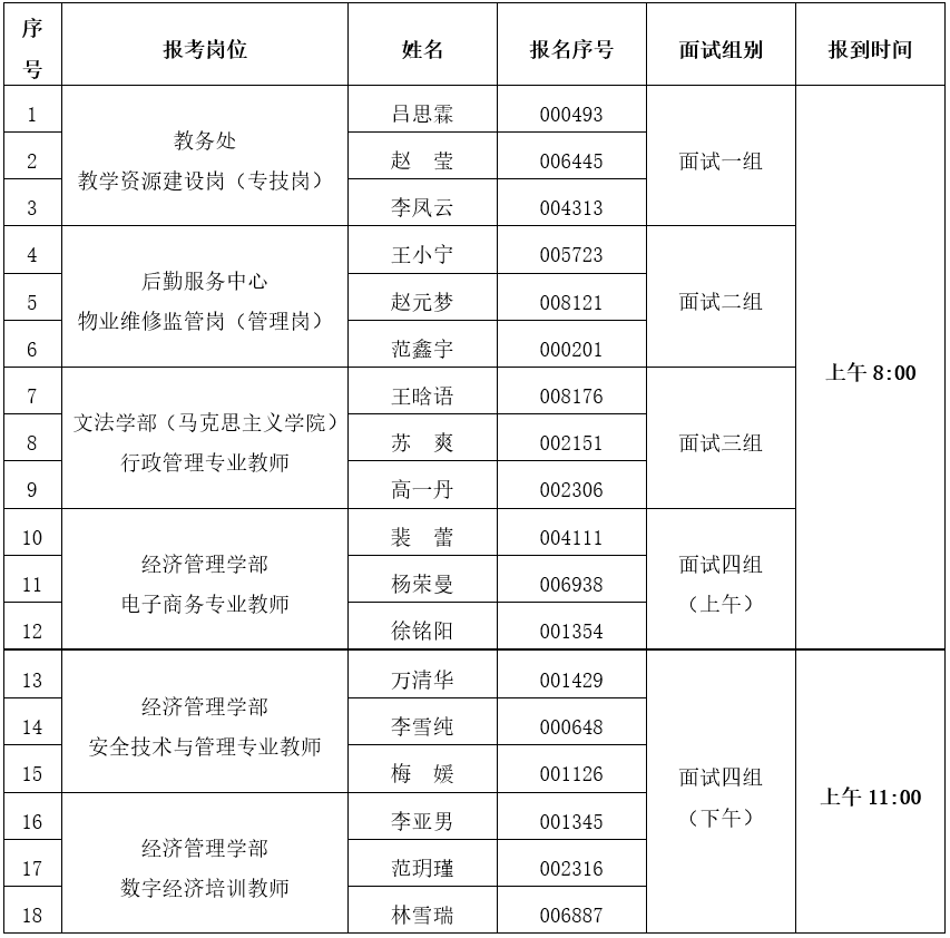 (三)请报考教学资源建设岗(专技岗)、物业维修监管岗(管理岗)、行政管理专业教师、电子商务专业教师的考生于上午8:00,报考安全技术与管理专业教师、数字经济培训教师的考生于上午11:00持二代居民身份证、面试准考证到1号楼三层301教室(候考室)报到。按照工作人员的安排进行验证抽签,缺少任一证件不得参加面试。