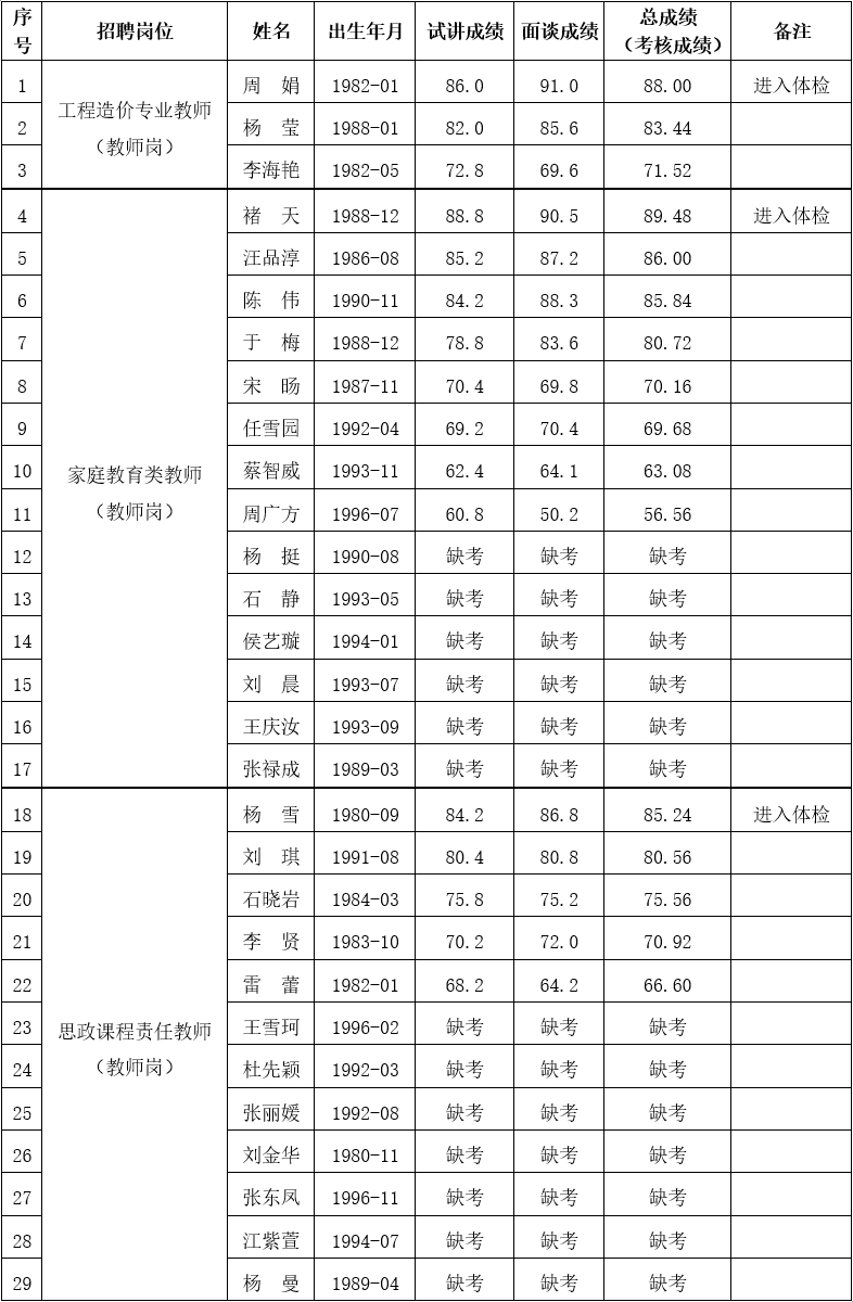 说明:考核成绩按试讲成绩占60%、面谈成绩占40%的比例合成。试讲和面谈成绩满分均为100分,保留1位小数。考核成绩即为总成绩,满分为100分,保留2位小数。