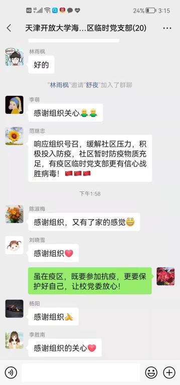 临时党支部党员积极响应,纷纷感谢组织关心,表示一定做好抗疫防控各项工作