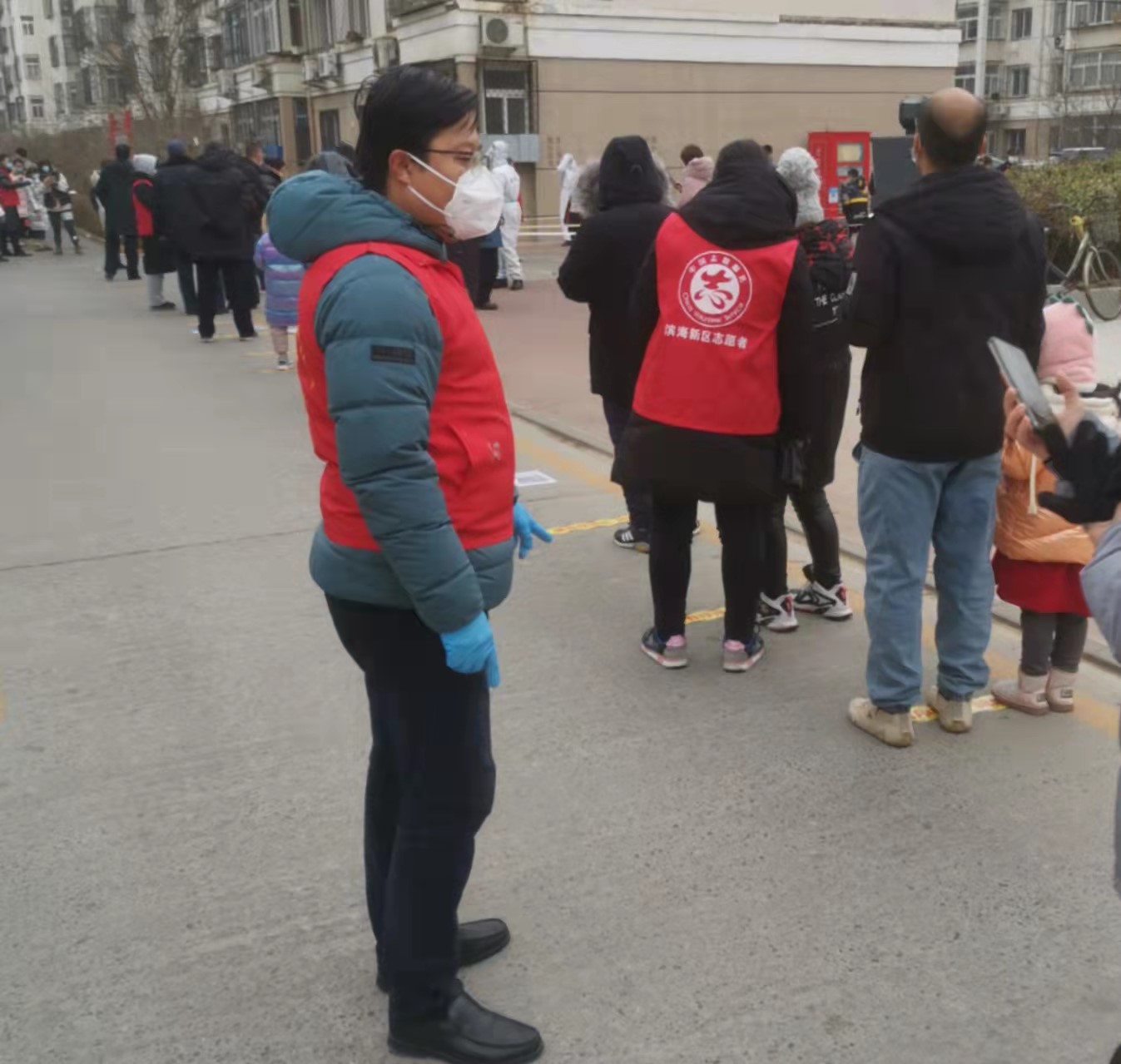 1月12日,民盟盟员赵宝磊老师参加了滨海新区晨晖北里社区第二次核酸筛查志愿服务,主要负责维持现场秩序,通知引导居民扫码登记信息。在冬日寒风中,他帮助眼花和不会使用智能手机的老年人完成信息登记,通过协调居委会和排队群众,为腿脚不方便的老年人和孕妇开辟了免排队绿色通道,为特殊群众提供了便捷和温暖,保障小区核酸筛查顺利进行。