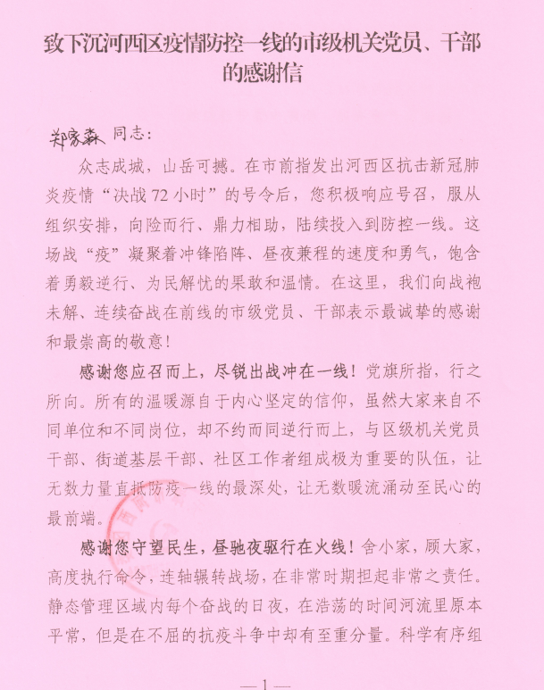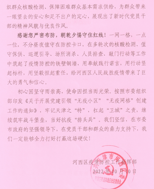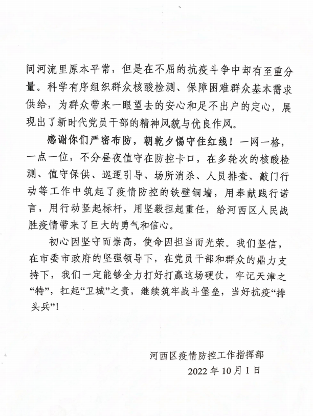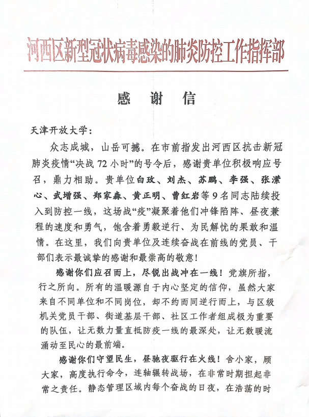 乐赢娱乐注册 广大党员干部积极响应党组织号召,落实党员进社区报到制度,党外人士也积极行动,迅速投身社区志愿服务,为打赢疫情防控阻击战贡献自己的力量。近日,河西区疫情防控工作指挥部向乐赢娱乐注册 发来感谢信,感谢白玫、刘杰、苏鹏、李强(经管)、张潆心、武增强、郑家淼、黄正明、曹红岩等9名同志,在疫情防控一线冲锋陷阵、勇敢逆行,向乐赢娱乐注册 连续奋战在前线的党员干部、党外人士表示最诚挚的感谢和最崇高的敬意!
