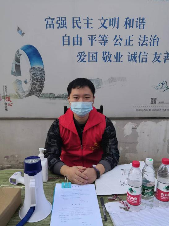 9月24日凌晨5点,社会教育学部直属党支部书记苏鹏同志居住地河西区尖山街开始施行静态管理。按照党组织要求,苏鹏同志即刻行动,作为下沉干部到河西区尖山街曙光里社区居委会报到并参与防疫工作。曙光里是尖山街老八大里之一,属老旧楼群,平时没有物业管理。苏鹏同志与其他下沉干部和志愿者一起,协助居委会人员组织和维持秩序,完成了1300多居民的核酸检测工作。苏鹏同志积极响应社区党组织要求,支援周边企业、社区疫情防控工作。受社区安排成为静态管控期间文才公寓社区临时党小组组长,协助社区居委会负责人参与了文才公寓疫情防控工作;参与了社区旁边企业——光电集团300多名员工的检测组织工作;在文才公寓、文贤公寓社区值夜班。苏鹏同志的出色表现获得了社区党委书记和志愿服务同志们的肯定。