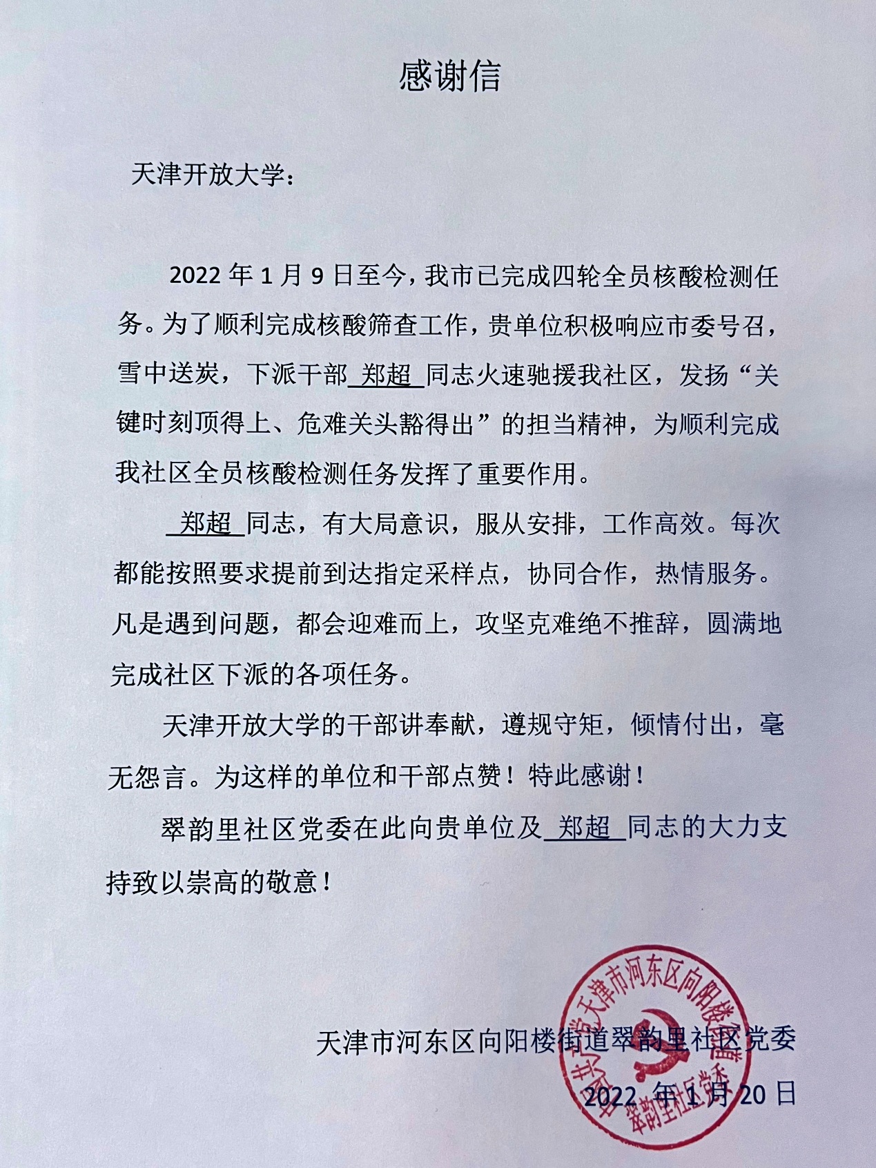 智慧教育研究发展中心的郑超同志,家住在河东区向阳楼星河花园。本轮疫情突发,他第一时间到向阳楼街道翠韵里社区报到,参加了3次核酸筛查志愿服务。郑超每天早上6点准时到达核酸筛查现场,协助社区做好维持秩序等服务工作。为了避免居民在寒风中长时间排队,他不畏辛苦、不惧严寒,入户组织居民有序进行核酸检测,切实为群众着想,为群众解难题。他忙前忙后的身影给小区居民留下深深的印象,得到了社区与居民的肯定与好评,用实际行动践行了新时代党员风采。