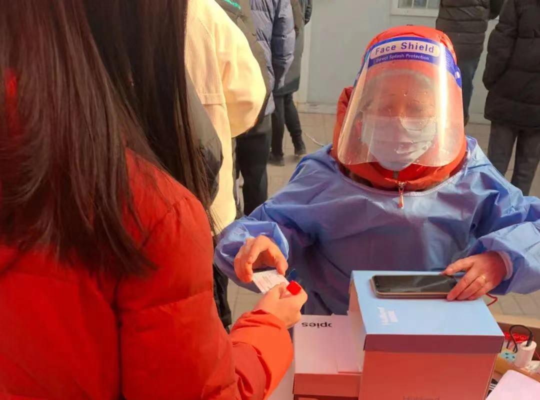 住在河北区的戚佳老师,在第三轮、第四轮核酸筛查志愿服务中,凌晨5点便到岗进行筛查准备工作。戚佳老师负责用手机录入居民信息,在凛冽的寒风中,她一待就是七八个小时,直到手指僵硬到无法按键,才被迫被替换下来。刚休息没几分钟,听说旁边小区检测点缺人手,她又主动请缨,投入到防疫检测志愿服务工作中。在第四次核酸筛查过程中,戚佳还自制了“身份证扫描仪”,既卫生又提速,工作效率大大提升。
