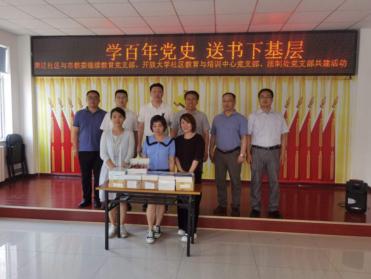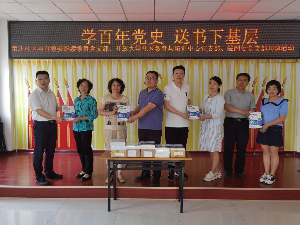 6月11日,社区教育与培训中心党支部与天津市教委继续教育处党支部、法制处党支部,深入南开区荣迁里社区,开展了“学百年党史、送书下基层”共建活动,为社区送去《社区教育系列丛书》以及“终身学习卡”,受到社区居民的欢迎。