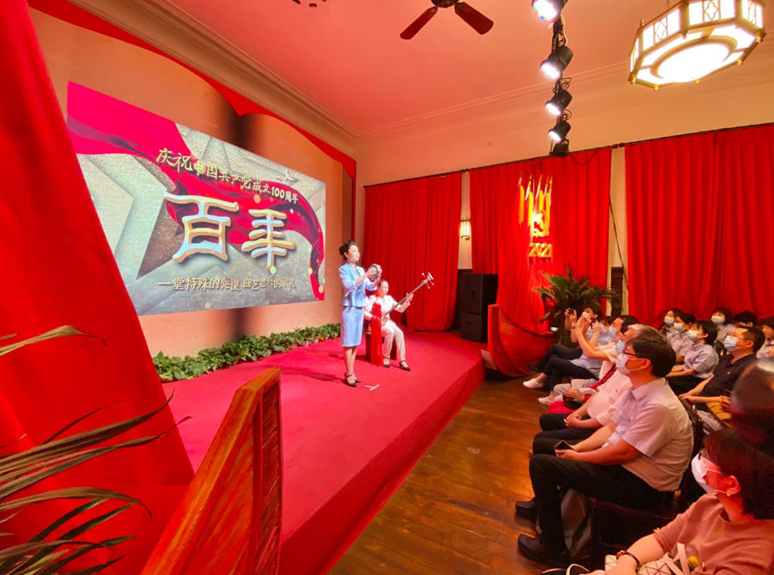 由天津北方演艺集团、天津市退役军人事务局、天津市关爱退役军人协会联合推出的“曲艺党课”《百年》在张园驻场演出。这场演出的表演者由众多天津籍军旅曲艺人组成,以庆祝建党百年为主题,以“忆往昔”、“看今朝”、“辩真理”、“赞家乡”、“学榜样”为线索,通过快板书、单弦、评书、独角戏等多种曲艺形式,回顾百年党史,歌颂革命先辈,开展党性教育。这堂特殊的党课,形式新颖,触动人心。最后,台下党员和台上演员共同重温入党誓词,深受教育。