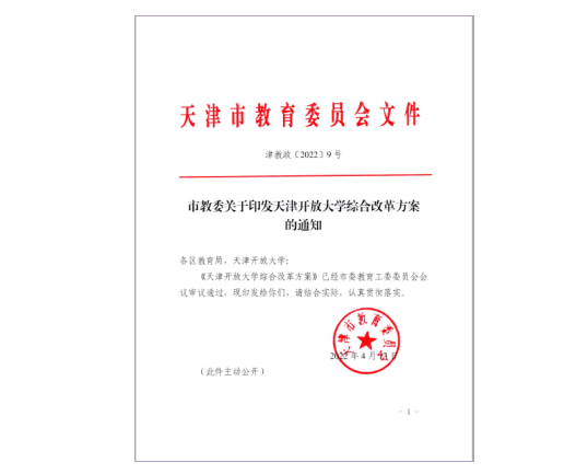 2022年4月13日,天津市教育委员会印发《天津开放大学综合改革方案》。这是为落实教育部《关于印发国家开放大学综合改革方案的通知》(教职成〔2020〕6号)和我市《天津市人民政府关于同意天津广播电视大学更名为天津开放大学的批复(津政函【2020】170号)要求,加快推进天津开放大学转型发展而采取的一项重要措施。